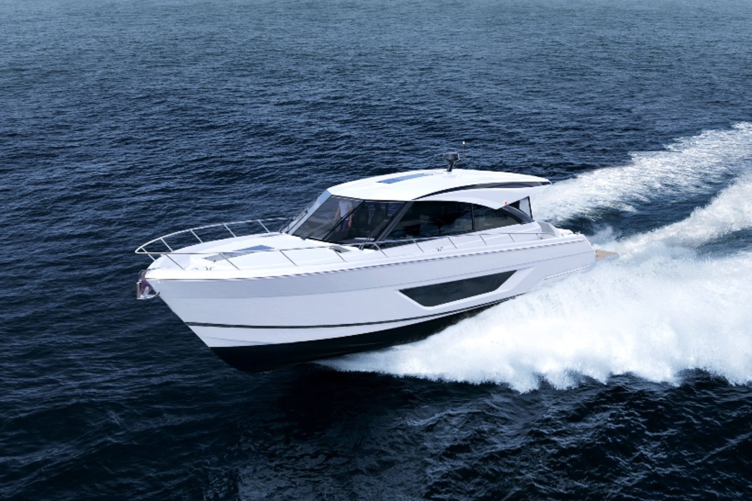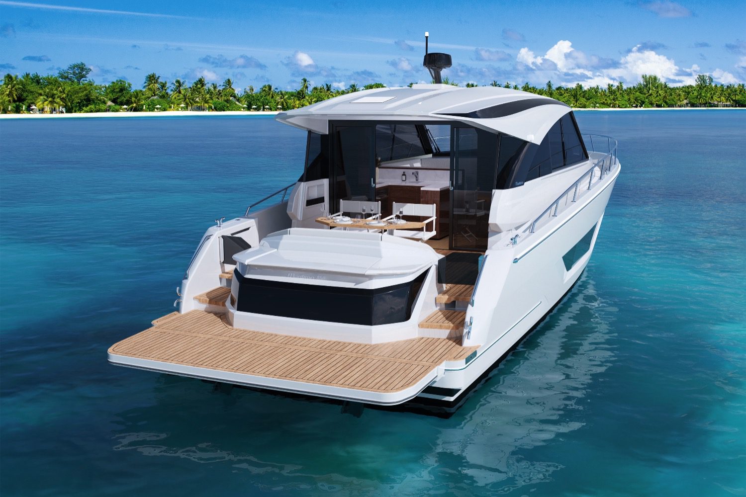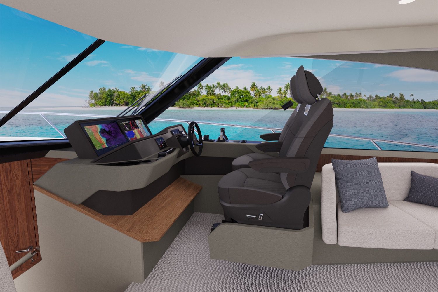 Even the hull profile has received attention to match the updates above deck. “We’ve modified the master cabin window to give it more definition and a slightly sharper edge,” explained McCabe. “It’s similar in form to the S-Series lineage, but now has a more modern, athletic look—a continuation of the design language that Senior Designer Julian Villegas has brought through in the new hardtop with those distinctive lines. It’s an aesthetic feature that makes the boat feel faster, even at rest. It refines the visual balance between strength and motion.”
