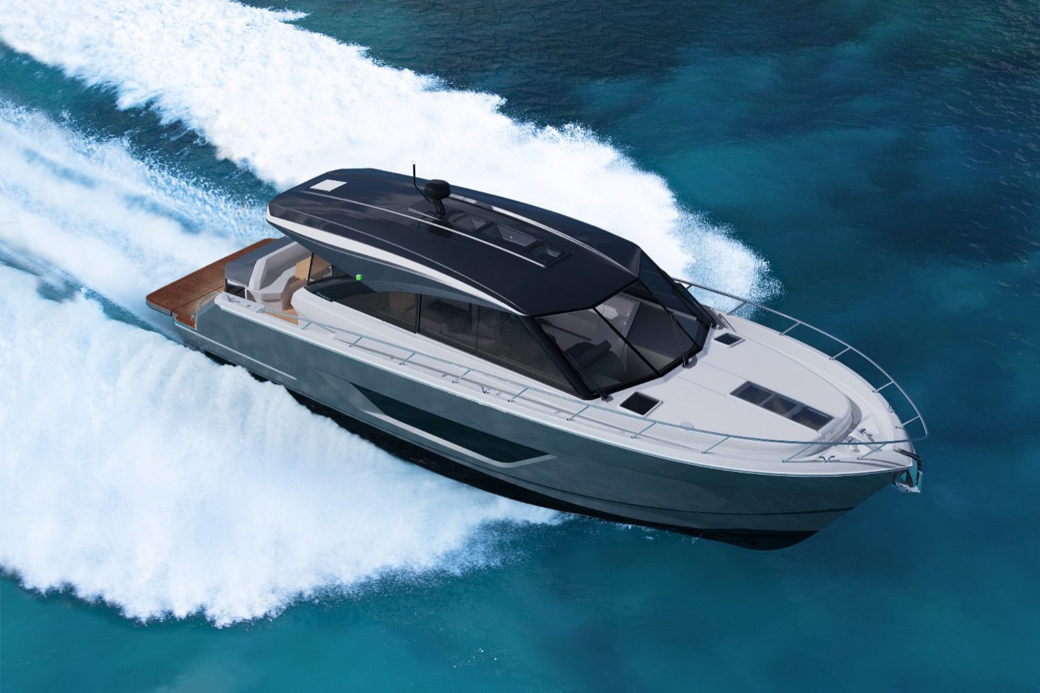 The silhouette is unmistakably Maritimo—muscular yet elegantly proportioned, with strong horizontal lines and an edgier, automotive-inspired profile. As a design exercise, there is a distinctive new slender hardtop that not only provides a sporty look but also keeps weight above to a minimum. The front windscreen is raked further to add dynamism, with new side windows opening from the front, and more rake in the rear pillar, which also houses fixed glass to elevate the cockpit experience.