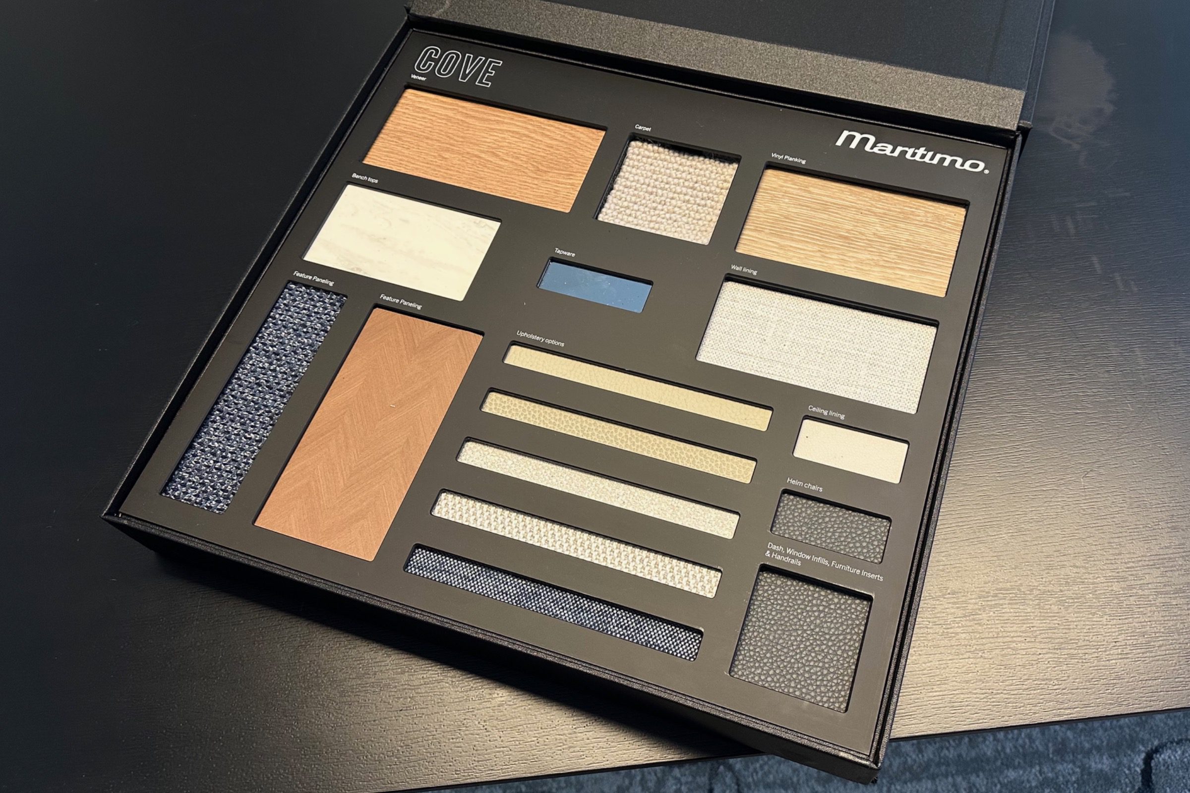 Included in this process has been the introduction of four handcrafted and highly bespoke interior design boxes. Custom-made for Maritimo, these beautifully finished kits are fitted with soft foam compartments, showcasing the brand’s premium timbers, soft furnishings, colour palettes, and finish options.