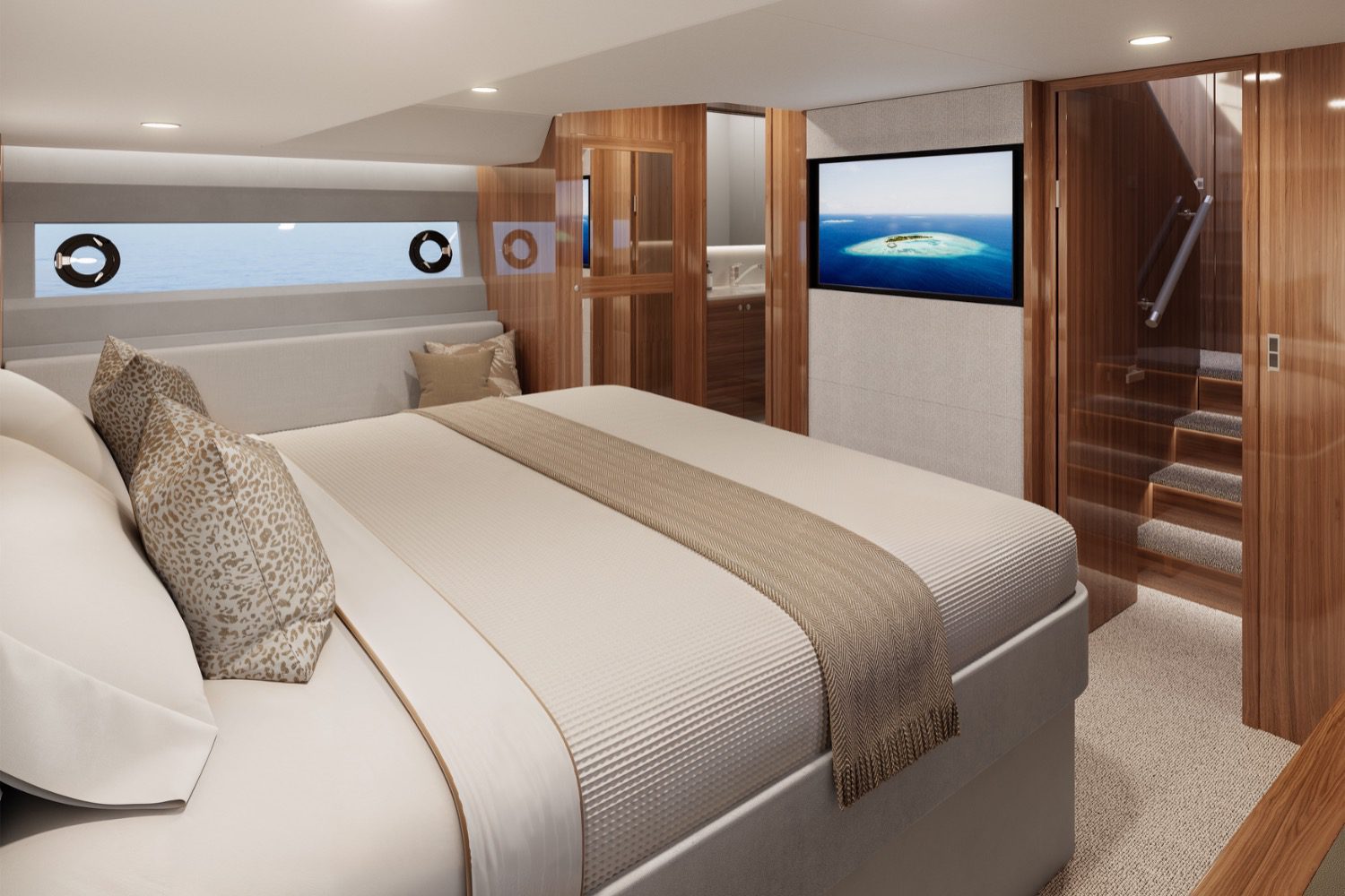 “The master cabin is quite symmetrical, with the hanger lockers at the forward end. The size of the cabin itself is bigger than what you’d experience on a 55, 60, or 600. The hull windows are also longer than what you’d see on a 55 because they’re the full length of the cabin and just short of the hanger locker. You’ve also got forward and out-opening windows on both sides of the hull windows. We have cabinetry on the starboard side as standard. And on the port side, we have a day lounge, and then you’ve got your big ensuite there.”