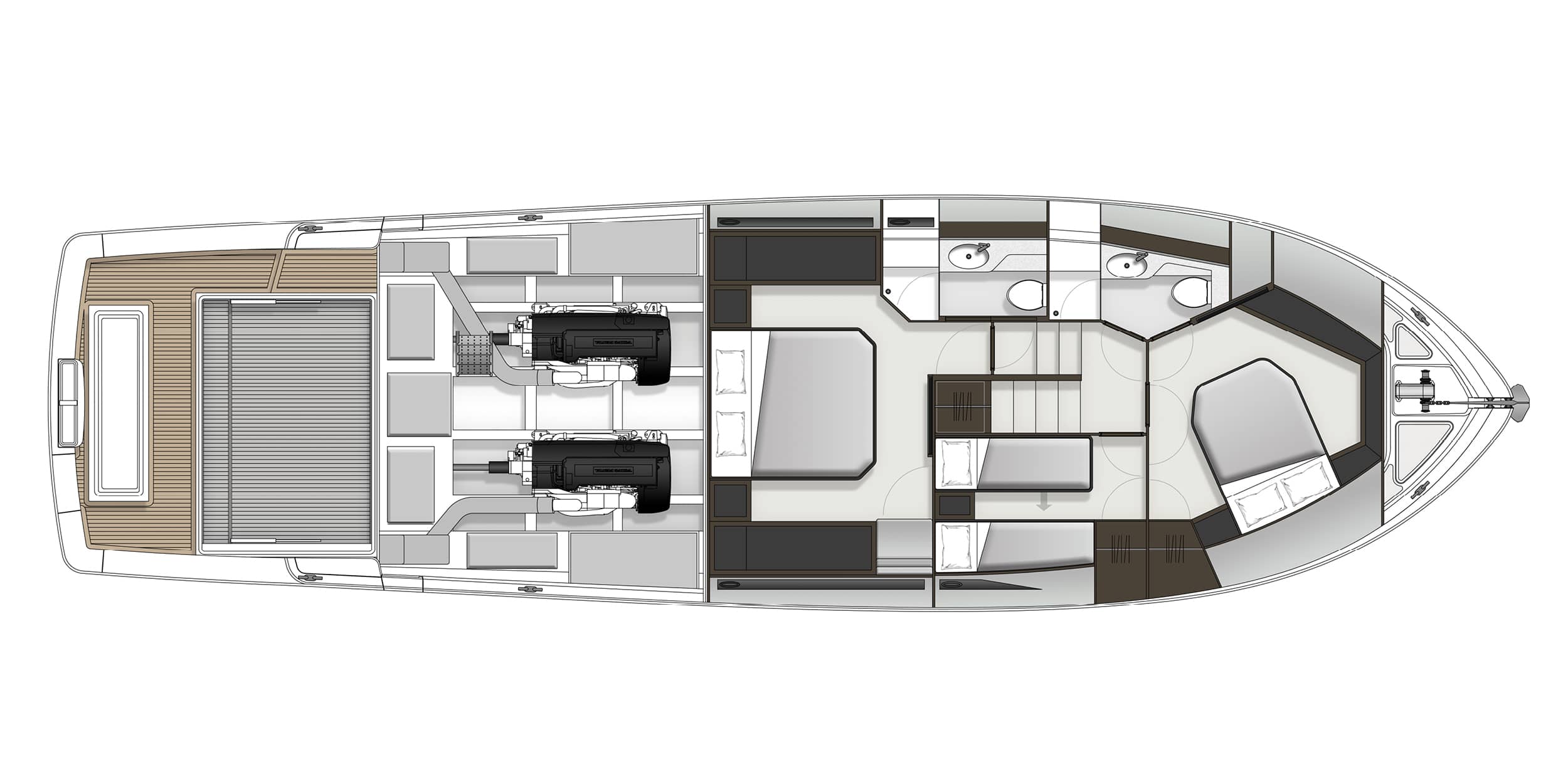 Below deck free-flowing spaces utilize the hull’s volume, maximising height and minimising the number of steps. Three spacious staterooms and two ensuites are on offer, with full-beam king master stateroom, offset queen forward stateroom, and twin single starboard guestroom.