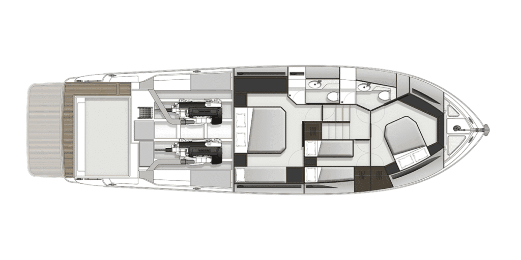 The amount of floor space offered in the upper cockpit alfresco deck leads the market in the mid 50 foot category, with standard rear U-shape lounging and dining table and further option of opposing lounging flanking each side of the area.