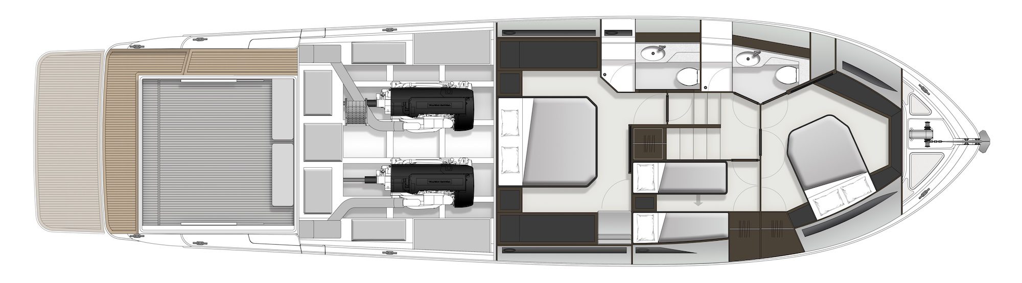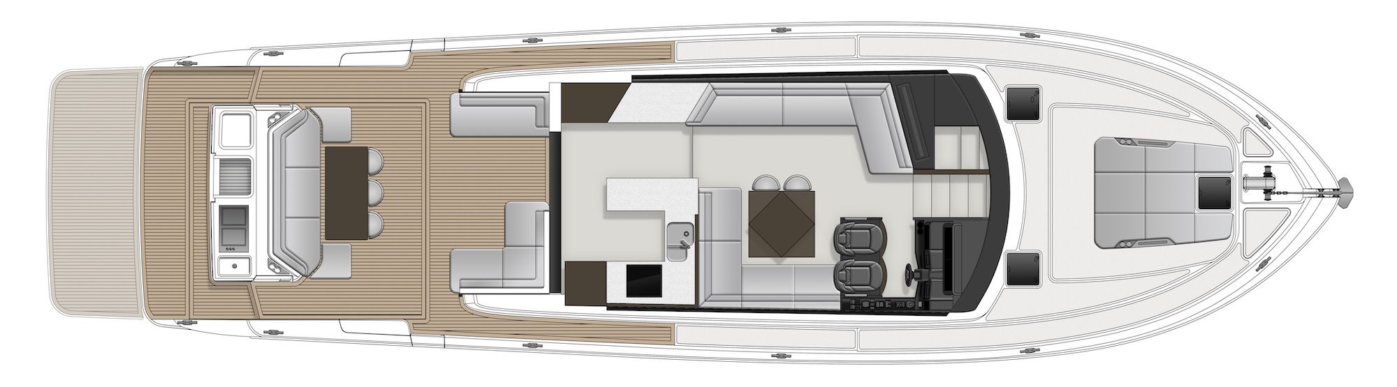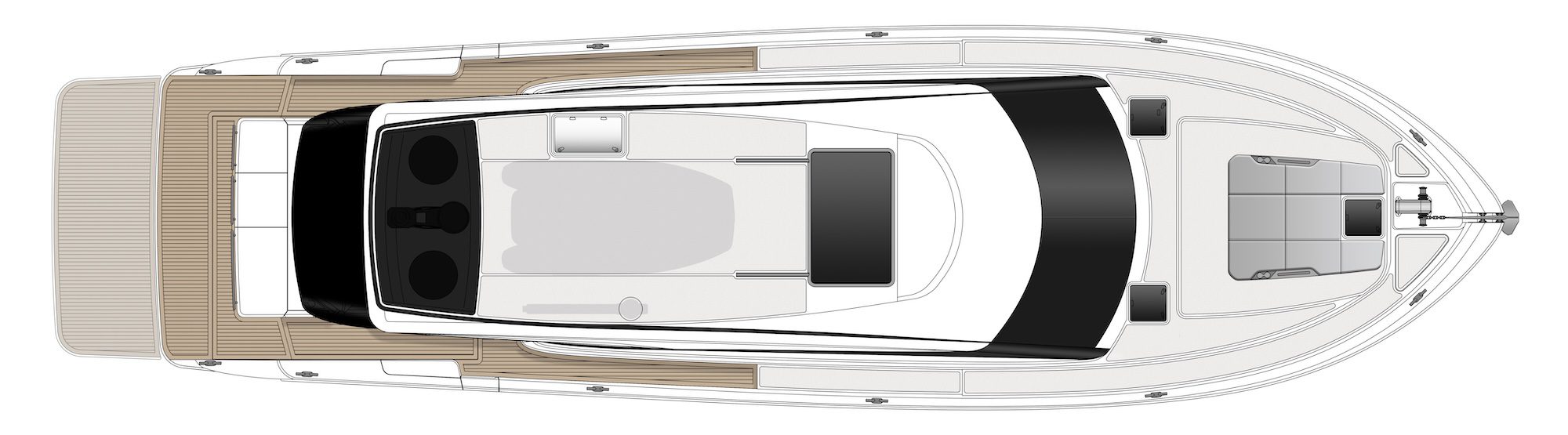 The reimagined adventure deck and lower cockpit space offers a fully lined 3.2m tender garage beneath, whilst the large alfresco upper cockpit provides considered and versatile living space. Deep walk-around decks with minimal steps provide safe and easy accessibility for the whole family.